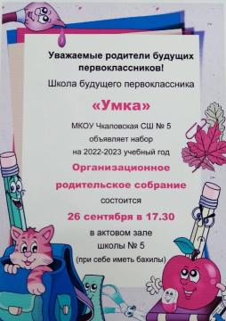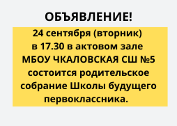 Организационное родительское собрание для будущих первоклассников пройдет 23.09.2025 (вторник) в 17.30 в актовом зале МБОУ Чкаловская СШ №5! При себе иметь бахилы.